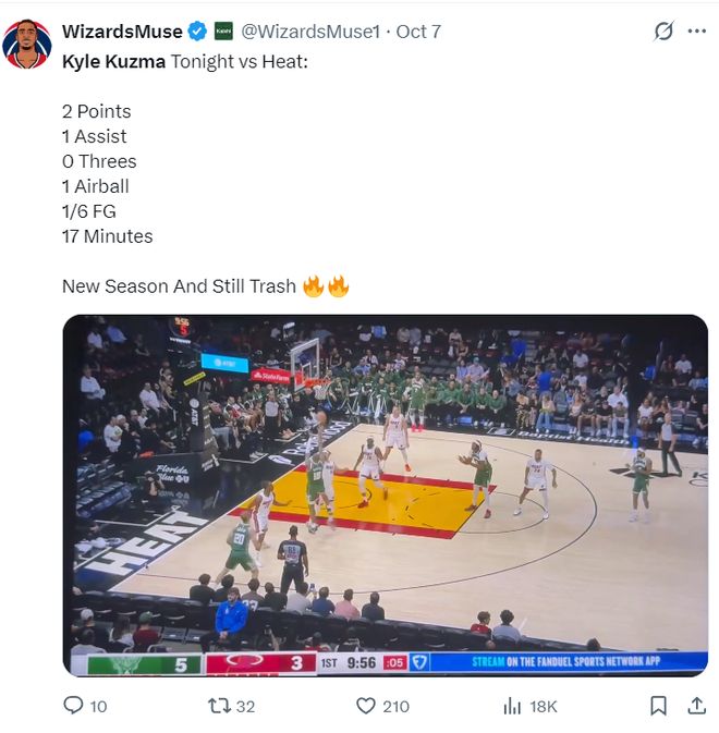 10月7日的季前赛首秀,6中1贡献三不沾,17分钟里怒砍2分,库兹马在场上的表现也很无力。