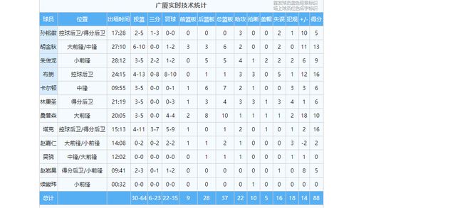 其中外援桑普森得到10分,布朗得到16分,卡尔顿得到6分,塔克得到16分。外援累计得到48分,外援得分占比约为54.55%。