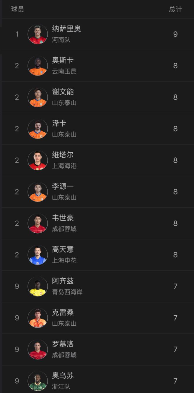 在奥斯卡离开后,中超助攻榜呈现群雄乱战。纳萨里奥9次助攻领跑。身后有7人8次助攻,4人7次助攻,因此末轮比赛谁能获得助攻王殊荣,悬念巨大。