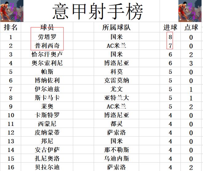 射手榜方面,劳塔罗今天传射建功,超过普利西奇,8球独居榜首,普利西奇7球紧随其后。恰尔汗奥卢和奥尔索利尼6球并列第3。邦尼,西蒙尼,卡斯特罗等人4球刚好挤入前十。